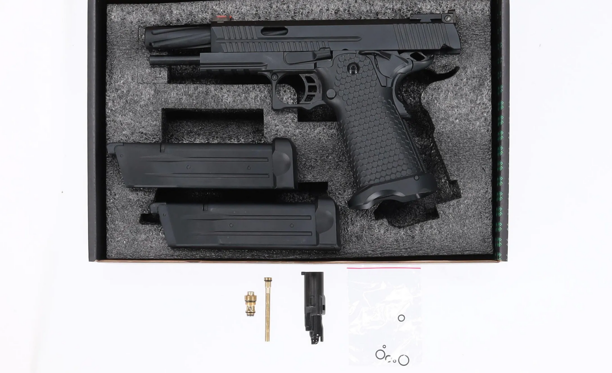 Modelis ir aprīkots ar optisko šķiedru tēmēšānas ierīces ar vienkāršu regulējumu. Lai iegūtu priekšrocības pār pretinieku, zem stobra ir sliede, kas ļauj piestiprināt lāzeru vai lukturi, un uz slide ir ribas, kas atvieglo pārlādēšanu. Kopējais dizains piesaista uzmanību ar savu neparasto un eleganto izskatu, kas piešķir produktam raksturu.